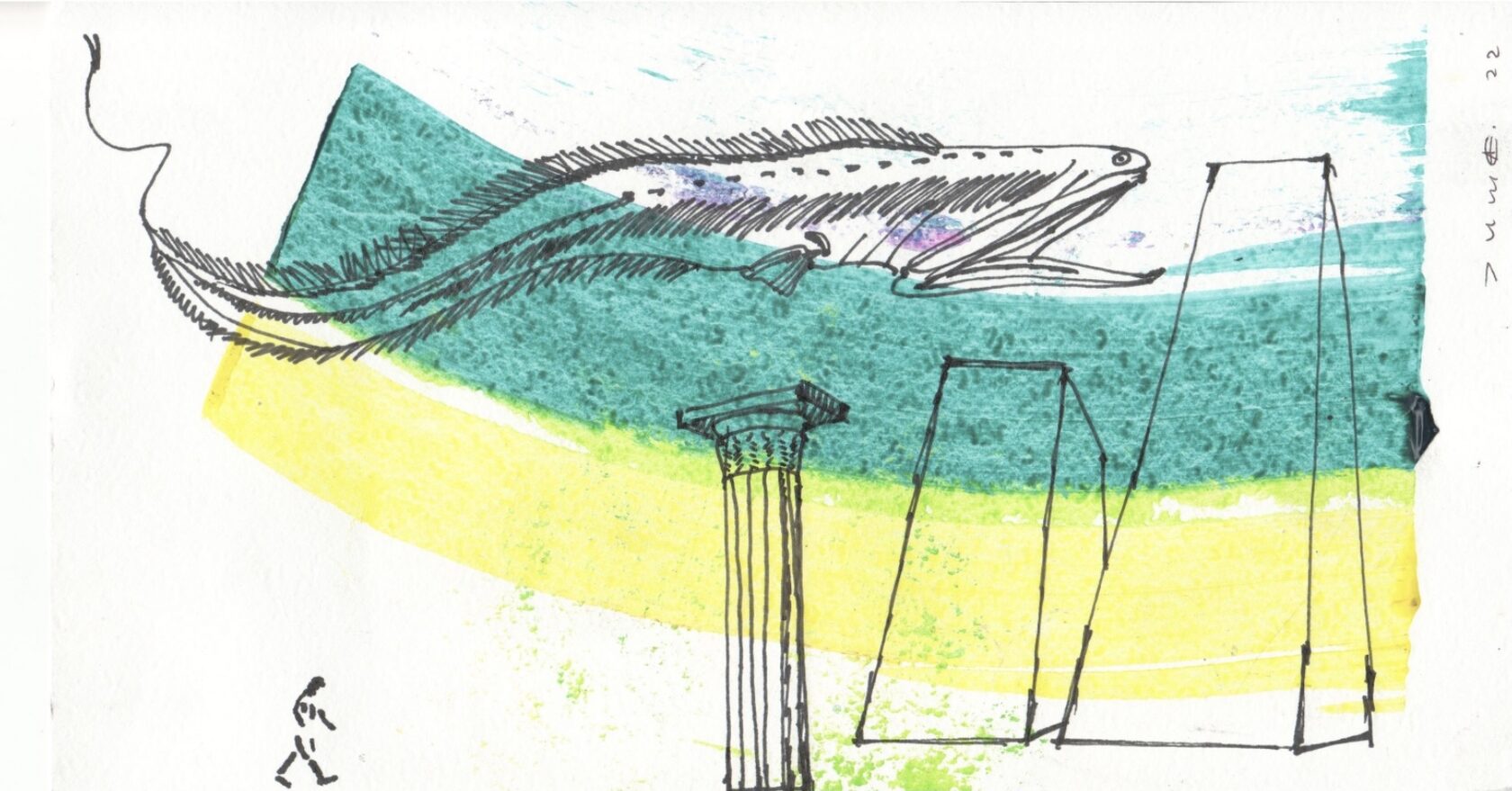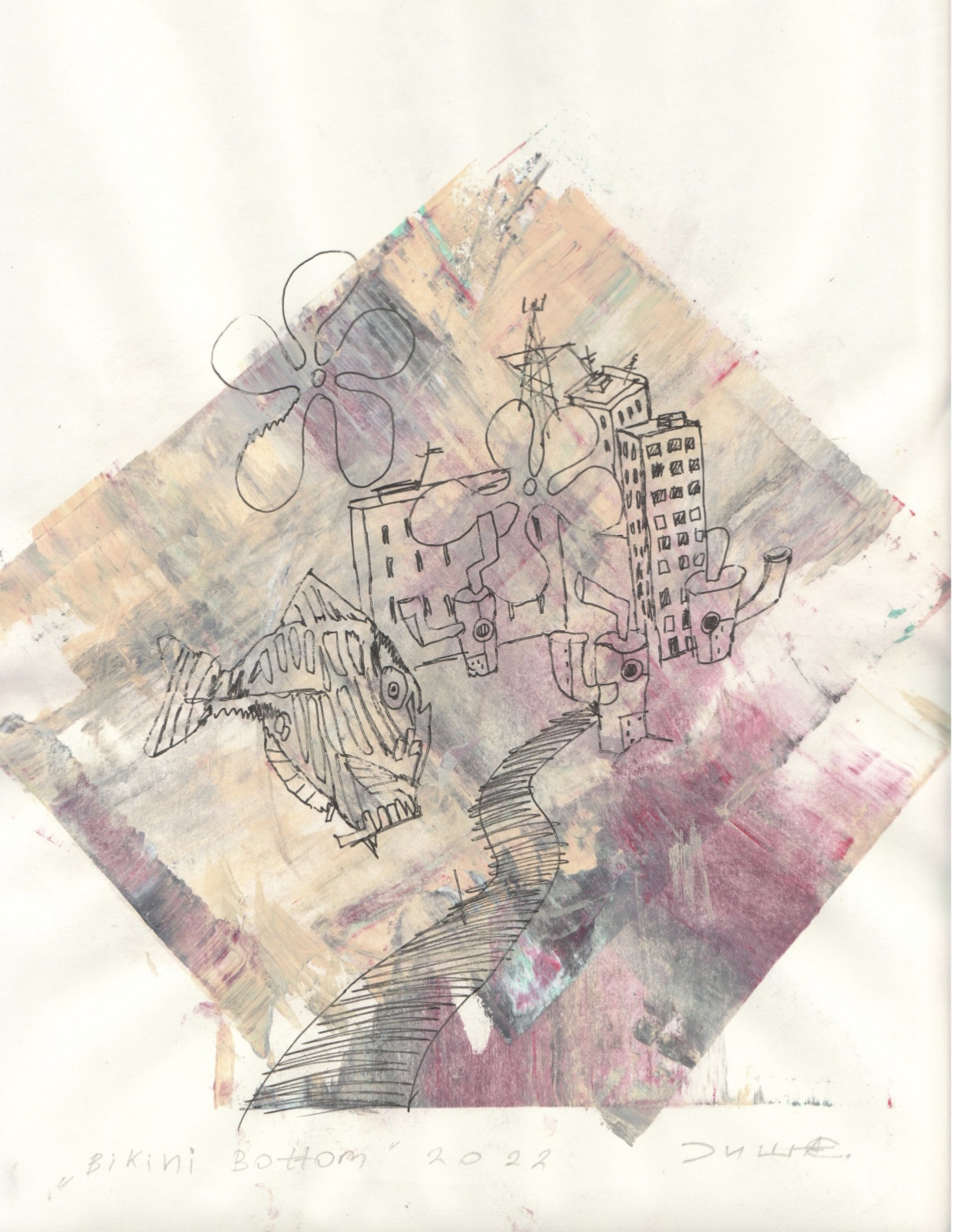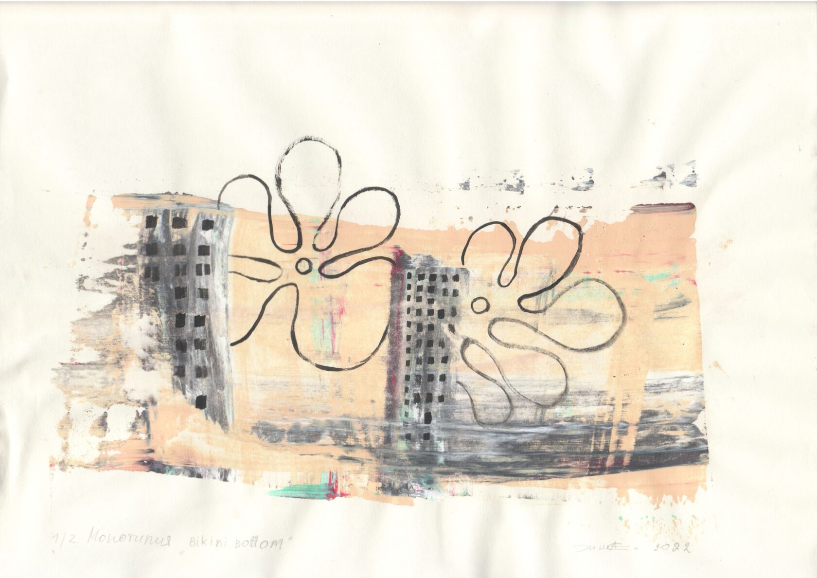 Александра Мартыненко исследует воду через образ катастрофы и потопа. В ее произведениях — от монотипий до живописных полотен — знакомые городские пейзажи оказываются под толщей воды, а улицы превращаются в аквариумы. Художница работает с собственным страхом глубины, размышляя, заложен ли он в нас на генетическом уровне, и одновременно поднимает вопрос об исторической неизбежности: действительно ли каждая цивилизация обрывается в момент катастрофы. Ее многослойные композиции, созданные с помощью шелкографии, трафарета и живописи, соединяют реальные сцены с фантазийными образами, создавая напряжение между документальностью и воображением.